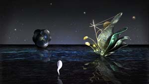 月と狂気をテーマに描いた抽象的な物語で。写真は、透明感のある巨大な花が海に浮いている場面。花のテクスチャは、オパール、ラピスラズリなどの鉱物からインスパイアされているという。