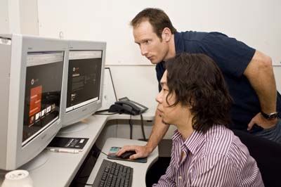 CGスーパーバイザーのパトリック・コーエンと「スピードレーサー」のライティング作業を行う吉田氏