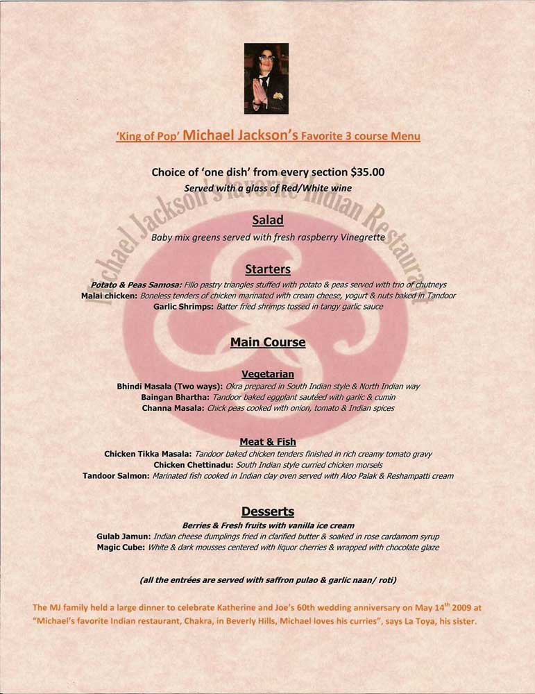 メニューの末尾には「マイケルお気に入りのレストラン。彼はカレーが好きでした。」という、マイケルの姉上で、歌手ラトーヤさんのコメントが紹介されています。