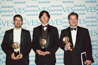 画像:VES2006にてOutstanding Animated Character in a Live Action Motion Picture部門で受賞を果たした、「キング・コング」のクルー。アニメーション・スーパーバイザを務めた佐藤篤司氏、アニメーション・ディレクターのChristian Rivers(左), Guy Williams (右)