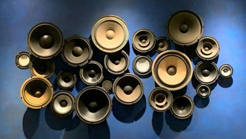 画像:サウンドミックスの建物の壁に、ズラリと並ぶスピーカーのオブジェ(筆者撮影)