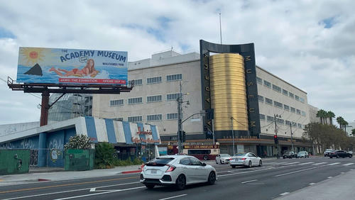 画像:「ジョーズ展」のビルボード広告と、その後ろに見えるのはアカデミー映画博物館(筆者撮影)