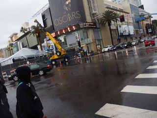画像:雨の中、アカデミー賞の前日準備に余念がないハリウッド&ハイランド(筆者撮影)
