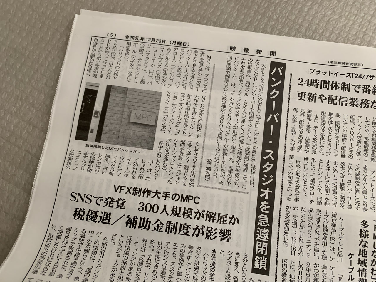 映像新聞の2019年12月23日号に「MPCがバンクーバー・スタジオを急遽閉鎖」という記事を寄稿させて頂きました。